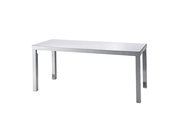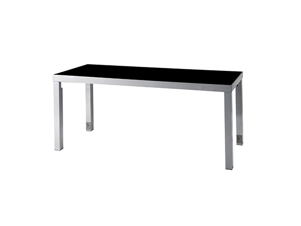 Laminate top with silver powder-coated legs in black, white and maple. No charging ports. Dims: 72.25" L x 26.25" D x 30" H
