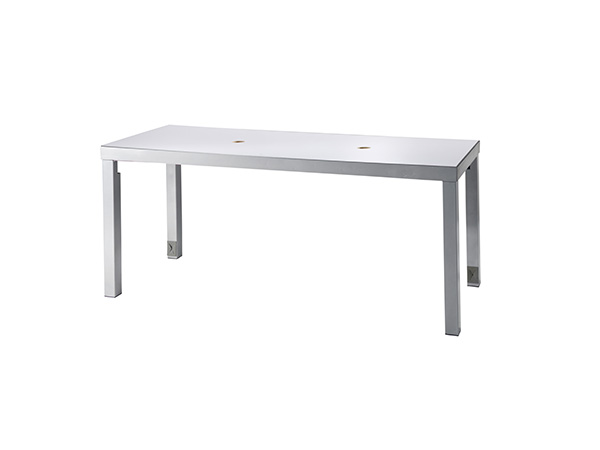 Laminate top with silver powder-coated legs in white and maple Charging hub with AC and USB ports Dims: 72.25" L x 26.25" D x 30" H