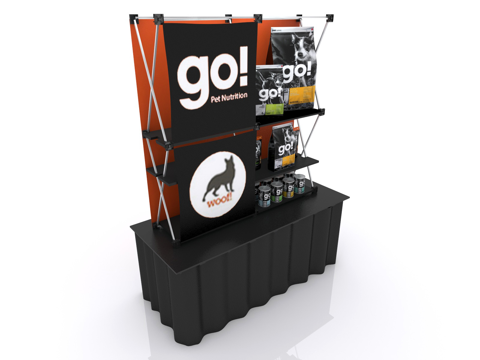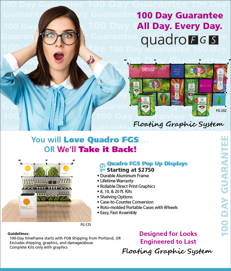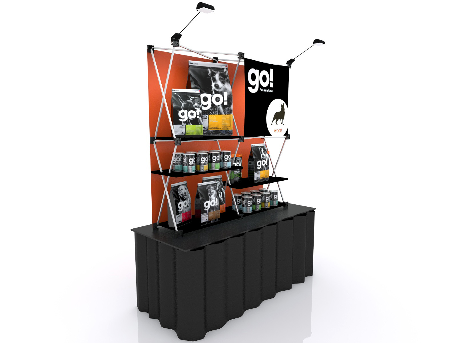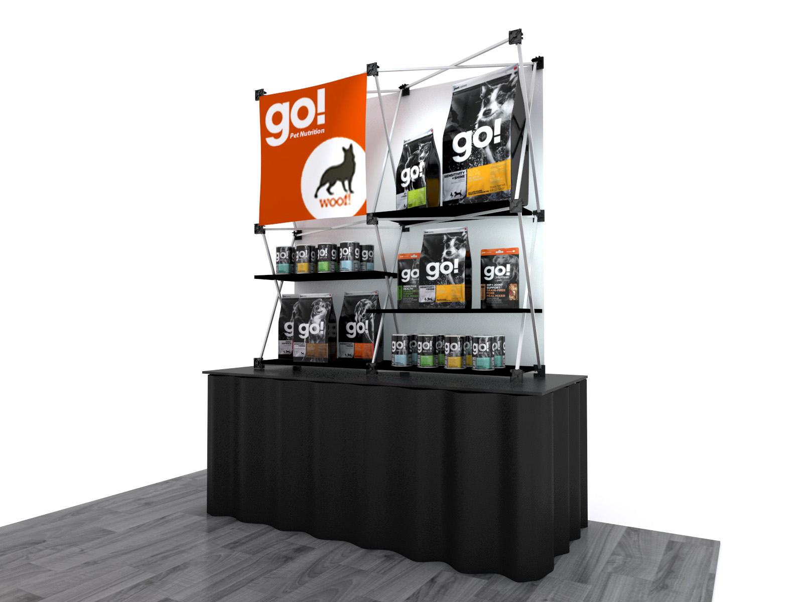 The Quadro Floating Graphic System (FGS) combines convenience and graphic pizzazz into an affordable, portable display. The Quadro frame expands in seconds, and the graphics attach easily with flexible rings. Need to change a graphic for a new product or marketing campaign? No problem. The individual panels make switching graphics quick and cost-effective. Elevate your presentation even more with a stylish printed lycra case wrap, instantly turning storage into a counter. Add lights and a backwall shelf for even more impact. The entire display assembles quickly, and disassembles even faster for a quick exit.