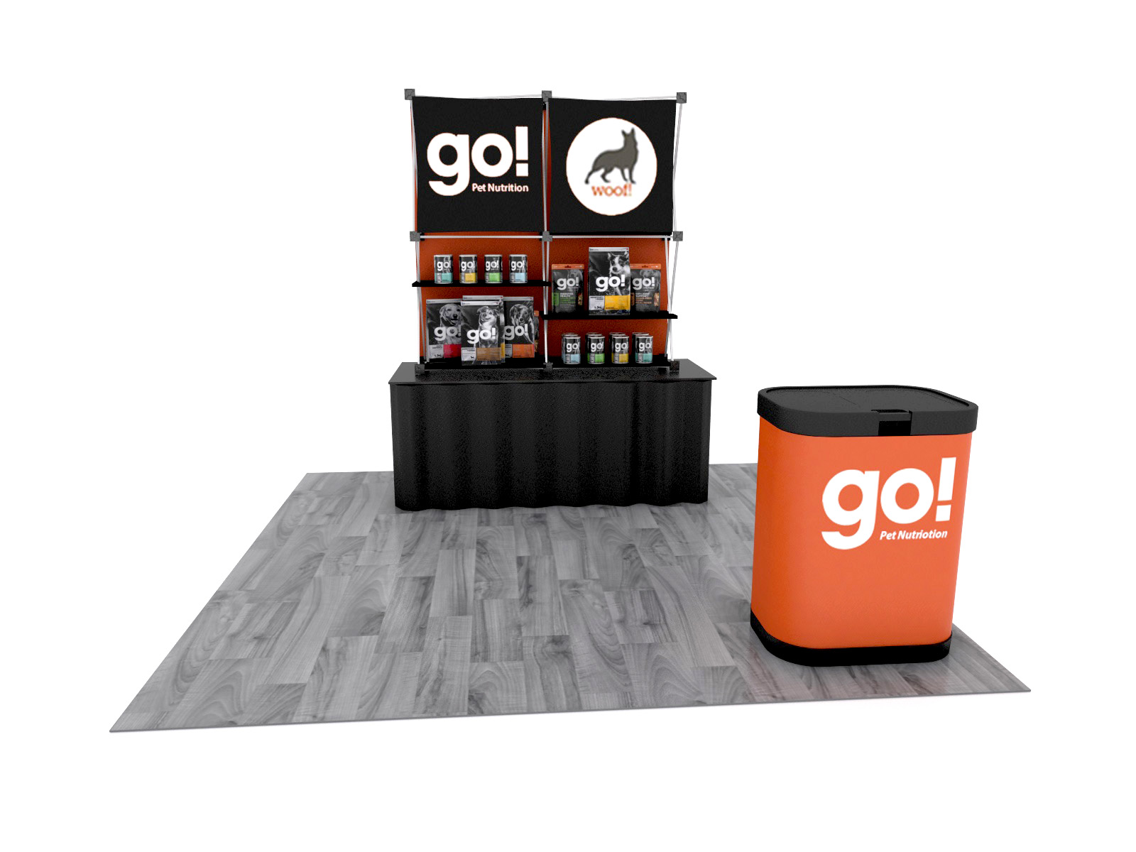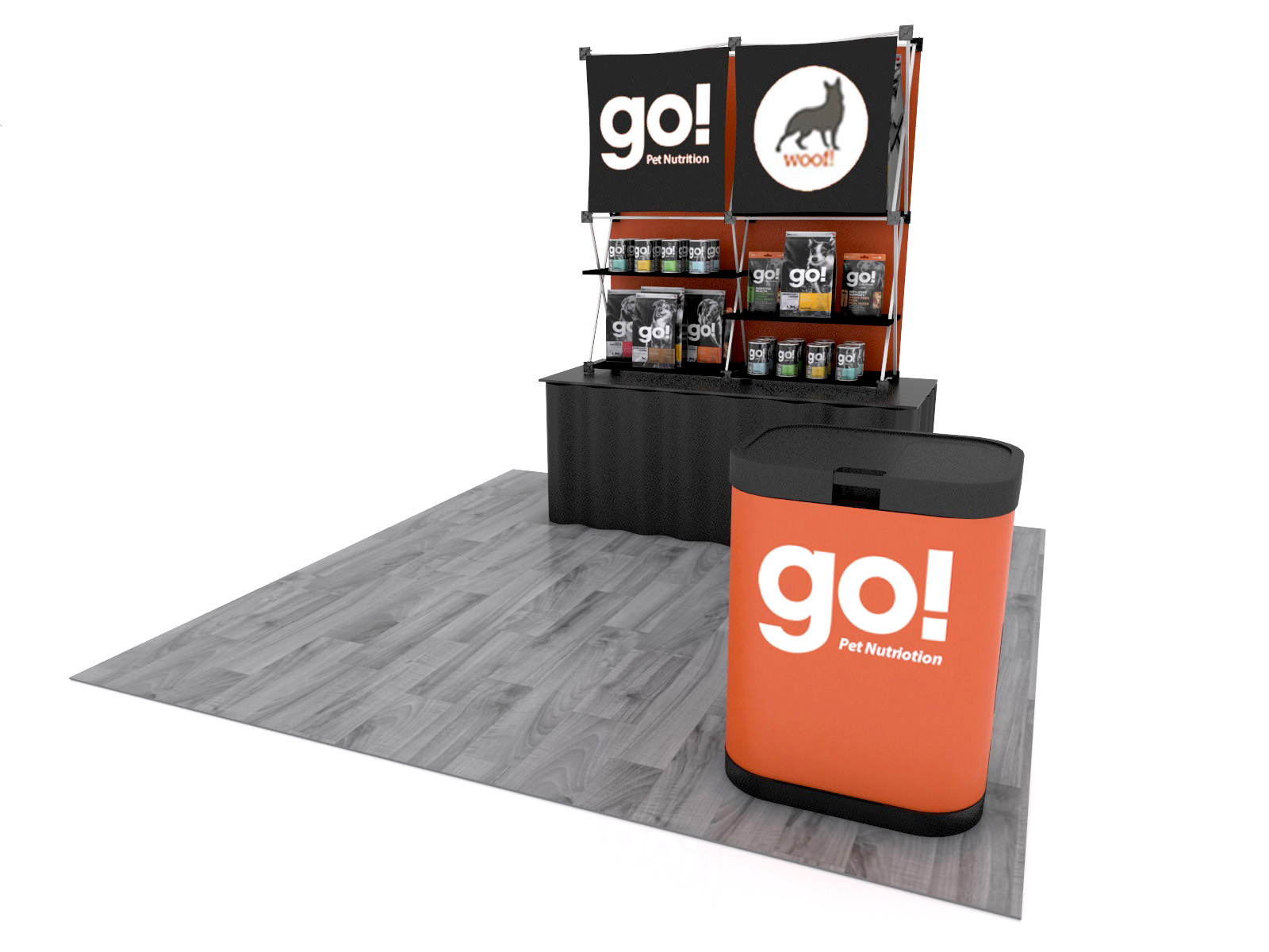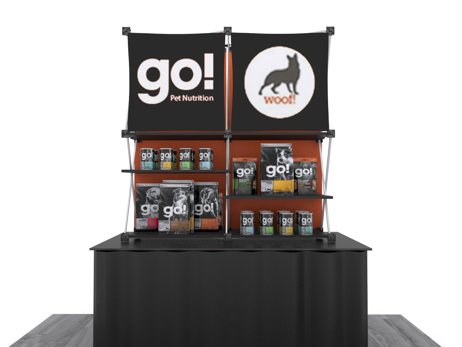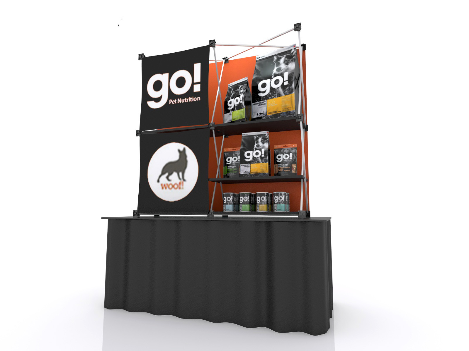The Quadro Floating Graphic System (FGS) combines convenience and graphic pizzazz into an affordable, portable display. The Quadro frame expands in seconds, and the graphics attach easily with flexible rings. Need to change a graphic for a new product or marketing campaign? No problem. The individual panels make switching graphics quick and cost-effective. Elevate your presentation even more with a stylish printed lycra case wrap, instantly turning storage into a counter. Add lights and a backwall shelf for even more impact. The entire display assembles quickly, and disassembles even faster for a quick exit.