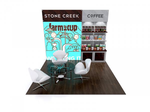 Striking the right balance between aesthetics and performance is crucial for any trade show display. The VK-1353 and VK-1354 blend those two perfectly with bold graphics, backlighting, practical features, and convenient storage. This exhibit offers a large backlit graphic for high impact along with direct print headers. In addition, there are shelves to showcase products and backwall storage with an internal shelf. the VK-1354 includes the MOD-1702 backlit counter with storage.. There's no question . . . this exhibit, whether the 10 ft. or 20 ft. version, will be the star of any trade show.