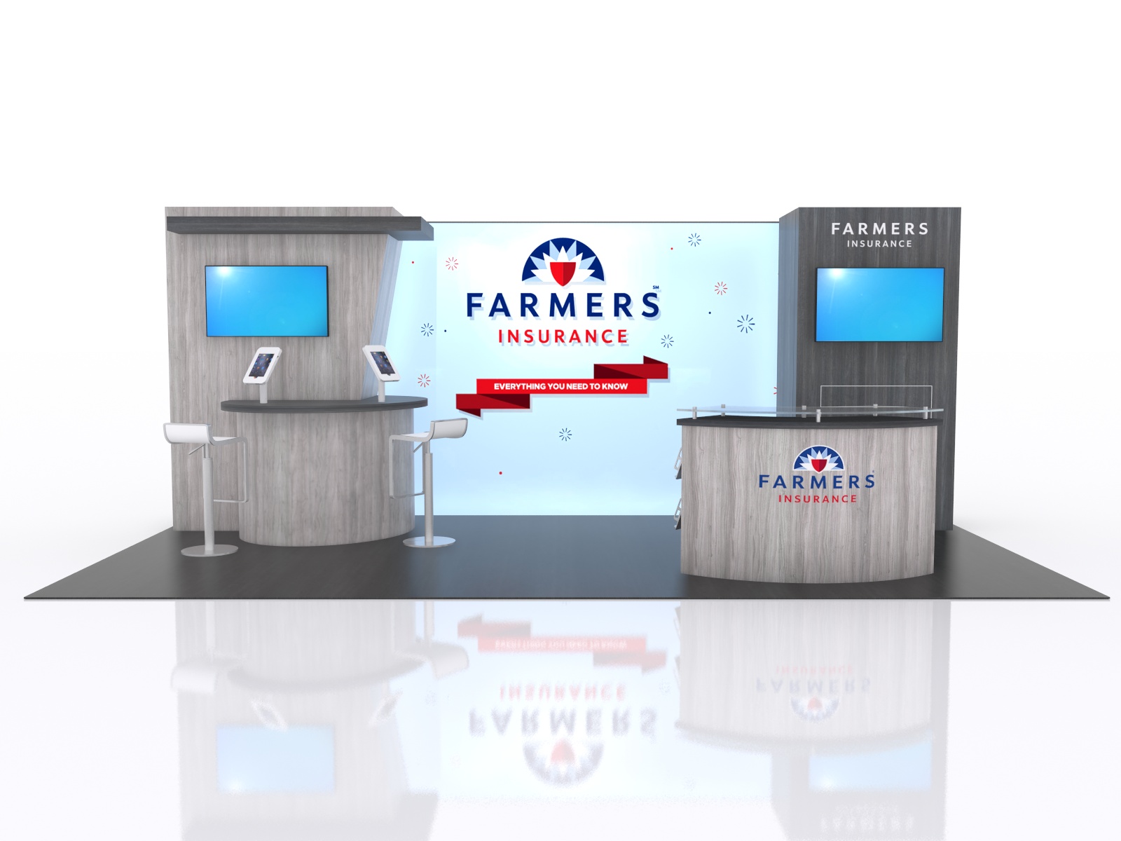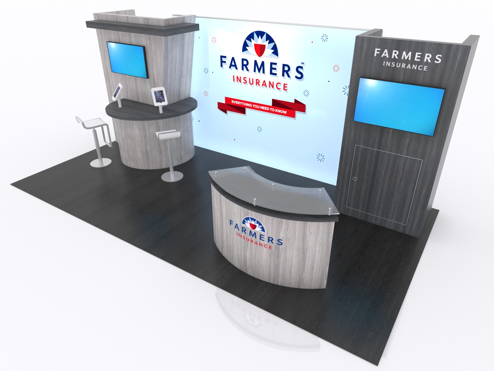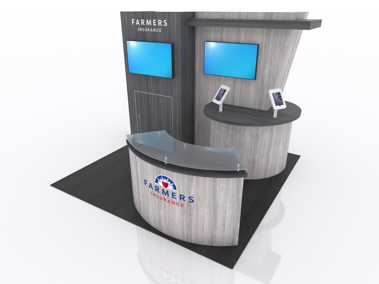 VK-4021 Trade Show Exhibit -- Image 1Trade shows should relaxing and productive, and the right exhibit makes all the difference. The VK-1129 and VK-4021 inlines includes a bar-height counter for seating with MOD-1329 iPad Swivel Mounts for browsing through a catalog or the company website. There's a reception counter with locking storage and literature holders, and two large monitors for videos or demonstrations. The opportunities for branding are endless by adding vinyl graphics or backlit logos.Best of all, you never have to worry about reconfiguring your exhibit. Easy switch from a 10 ft. to a 20 ft. inline.