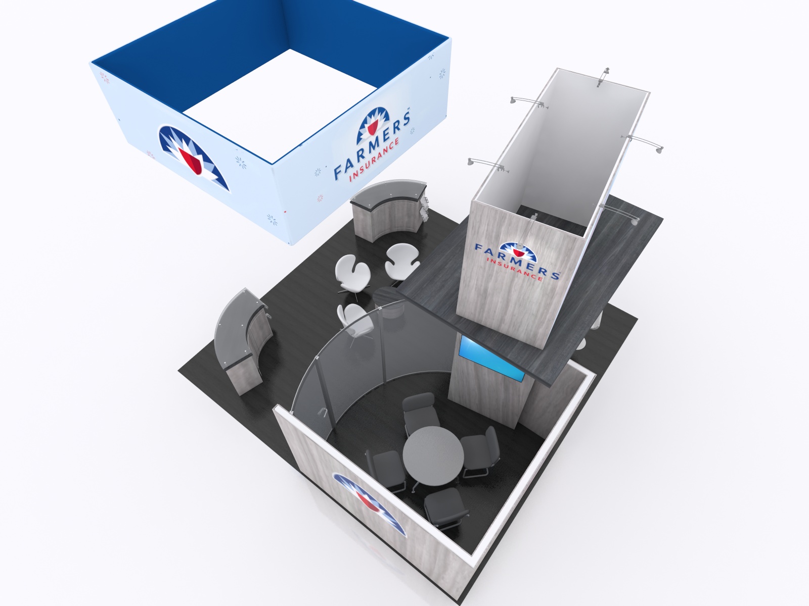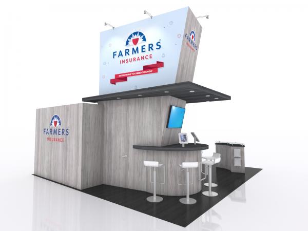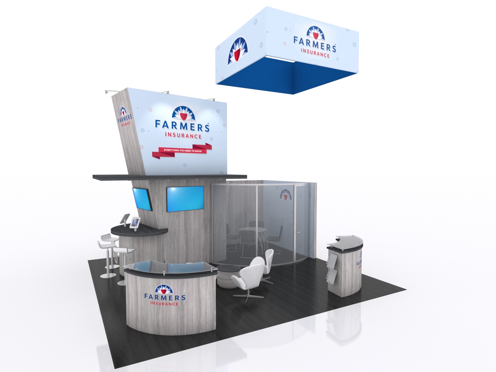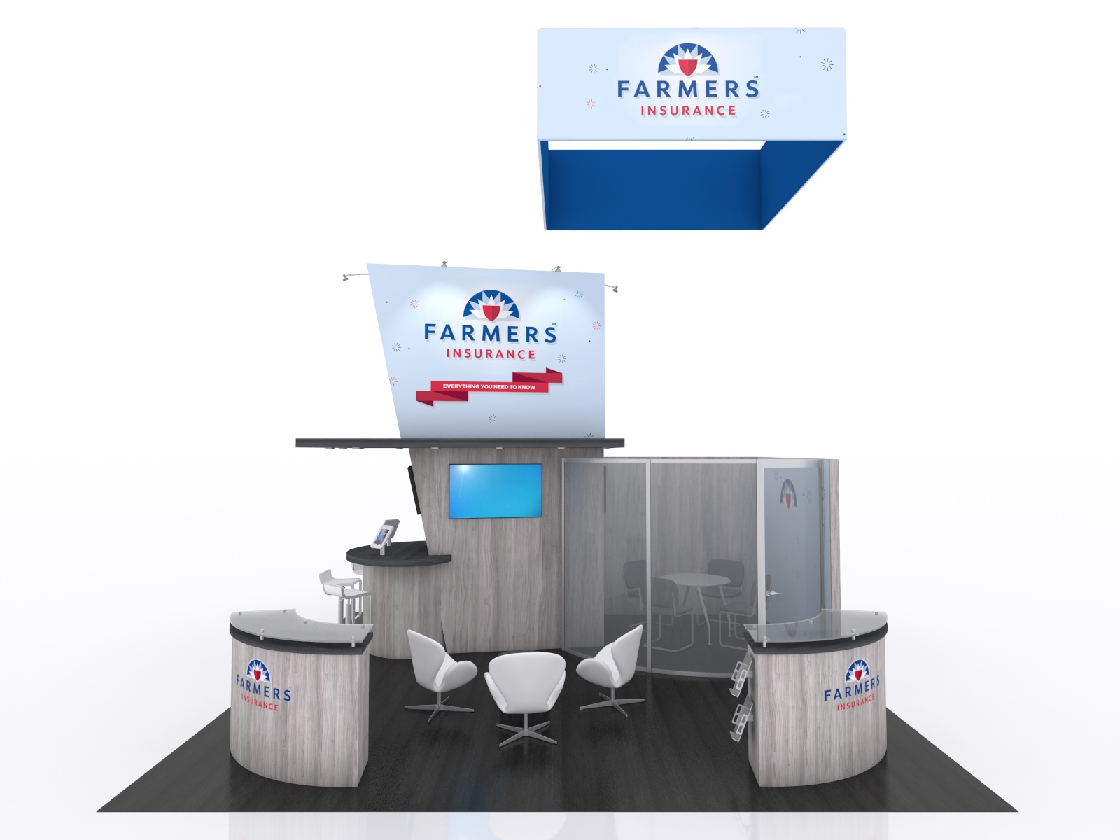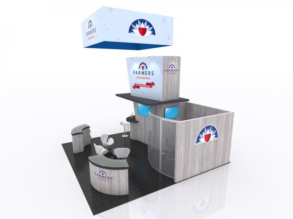 Trade shows should relaxing and productive, and the right exhibit makes all the difference. The VK-5167 island includes a bar-height counter for seating with MOD-1329 iPad Swivel Mounts for browsing through a catalog or the company website. There's are two reception counters with locking storage. A casual seating area, and a semi-private conference room. There are even three large monitors for videos or demonstrations. Above it all, there's two prominent branding signs. Perfect for catching an attendees attention across the show floor or two aisles away. .