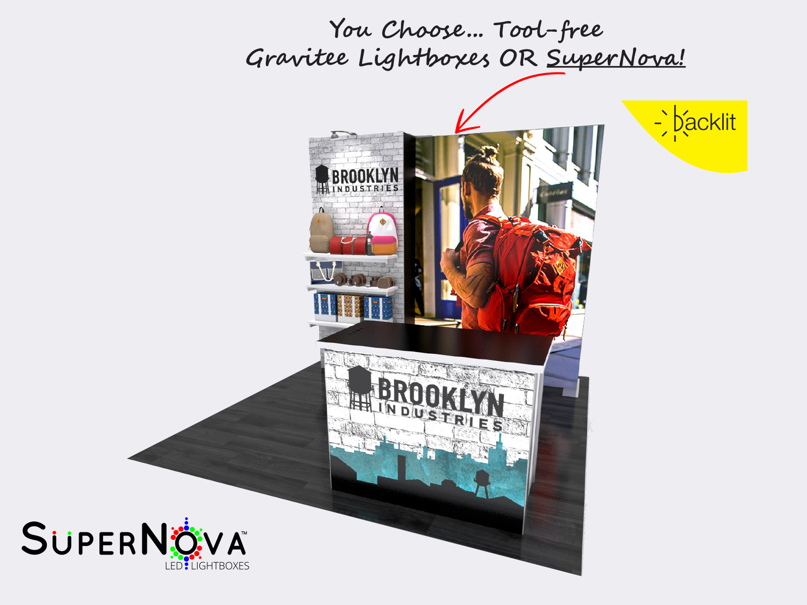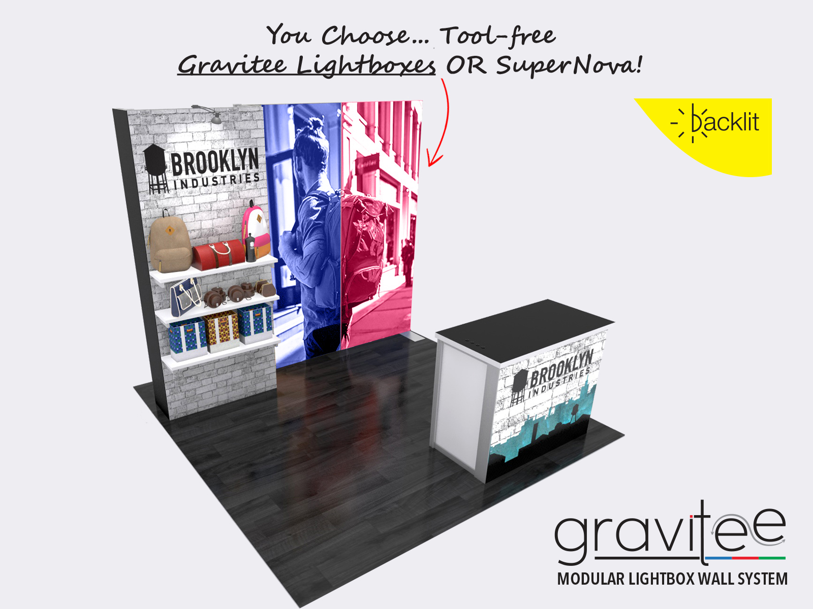 Design flexibility is critical for many exhibitors. Not only do they want to change the graphics depending on the trade show, but they also want the flexibility to add accessories and mix and match the structure. The GK-1018 and GK-1020 accomplishes all that while providing the modern exhibitor with product shelves, storage, and a dynamic backlit MOD-1700 reception counter. In addition, the Gravitee One-Step System makes it easy with a mostly tool-free assembly, including the (3) LED Lightboxes or (1) SuperNova LB. The open floorplan allows for the addition of rental furniture for casual conversations or informal meetings. Plus, because the Gravitee System is modular, expanding the inline into an island design couldn't be easier. For the ultimate tradeshow display, look no further than Gravitee. Flexibility. Design. Convenience.