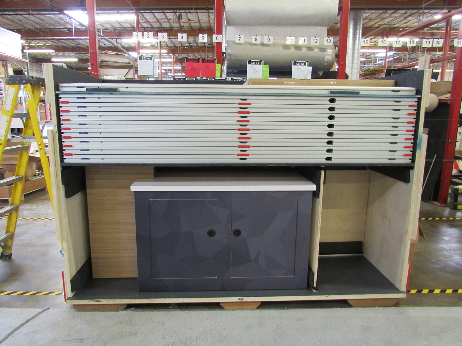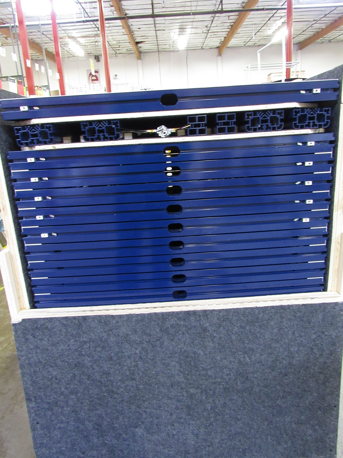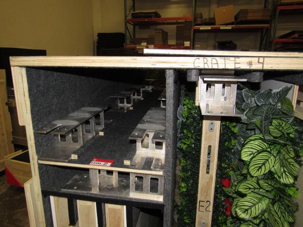 Custom Wood Crate -- Crate Jigging Example #9If you’re envisioning a big wood box, you couldn’t be more wrong. Our custom wood crates are fabric lined and jigged to fit all the components of your display. The layers and components are labeled and cross-referenced to detailed set-up instructions, which included specific packing instructions. Many custom crates have hinged doors and individual compartments, depending on the specific design.