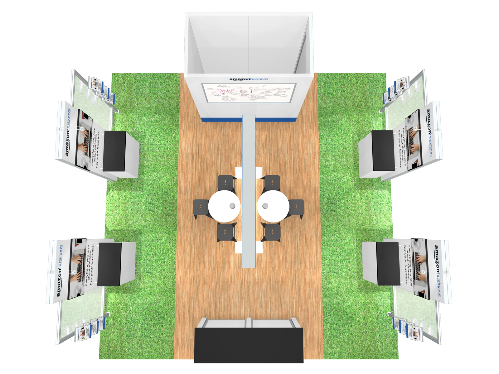 A well-designed rental island exhibit should be attractive, inviting, informative, and practical. The RE-9127 does all that... and more. It combines lightboxes and vibrant graphics with functional monitor kiosks in a booth design that welcomes business conversations and problem solving. There are multiple locking counters and a full-size closet for secure storage. The 12 ft. high central tower include meeting area. Finally a large square overhead hanging sign ensures visibility throughout the exhibit hall.