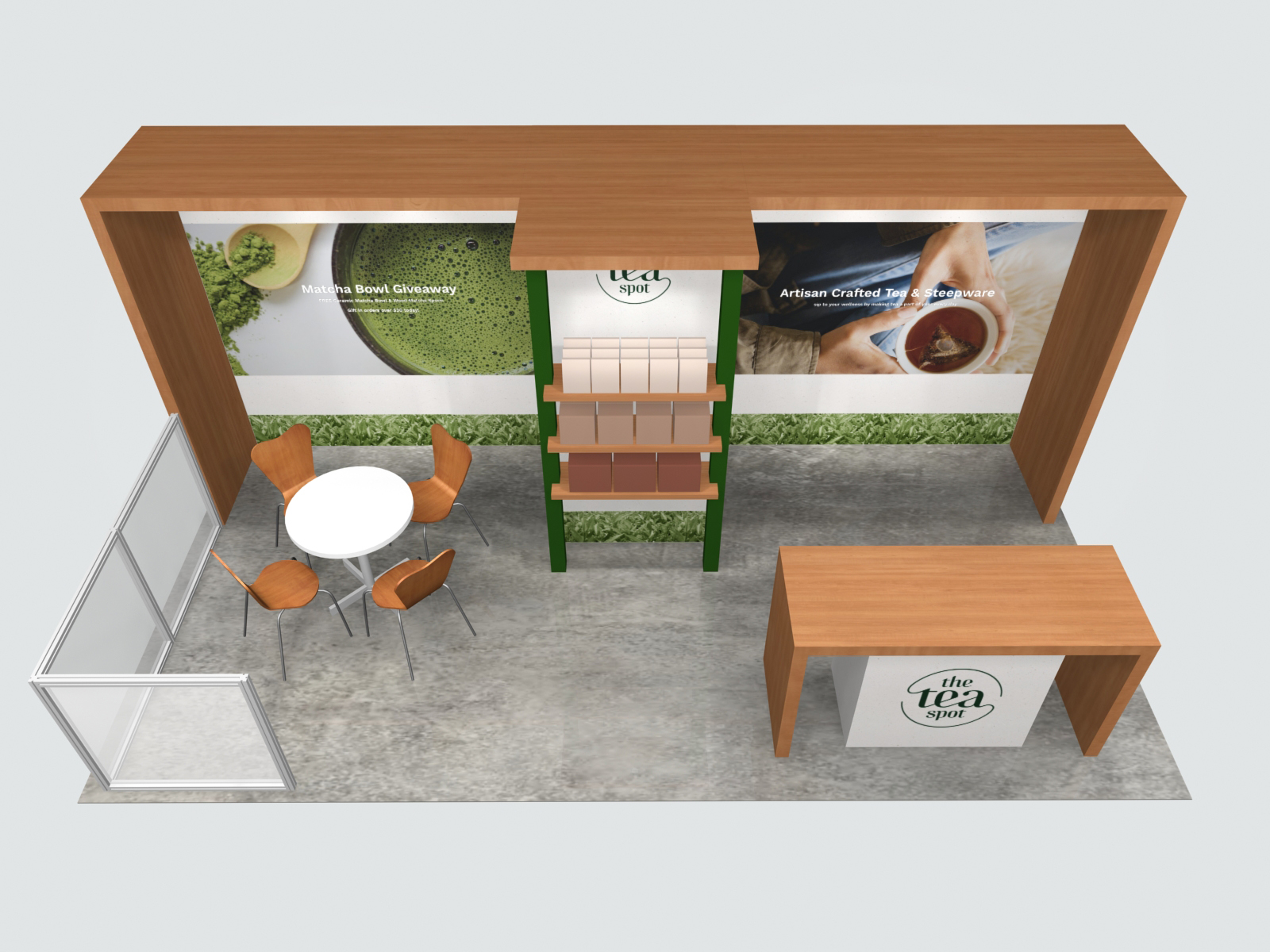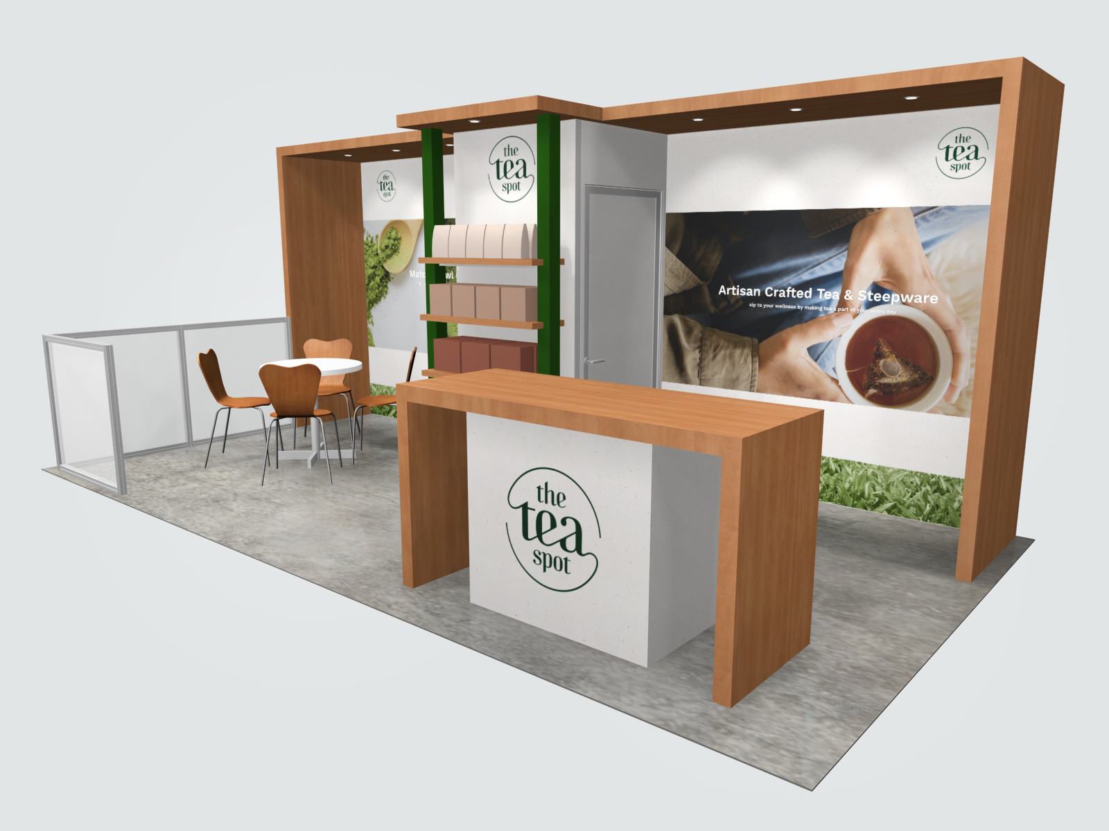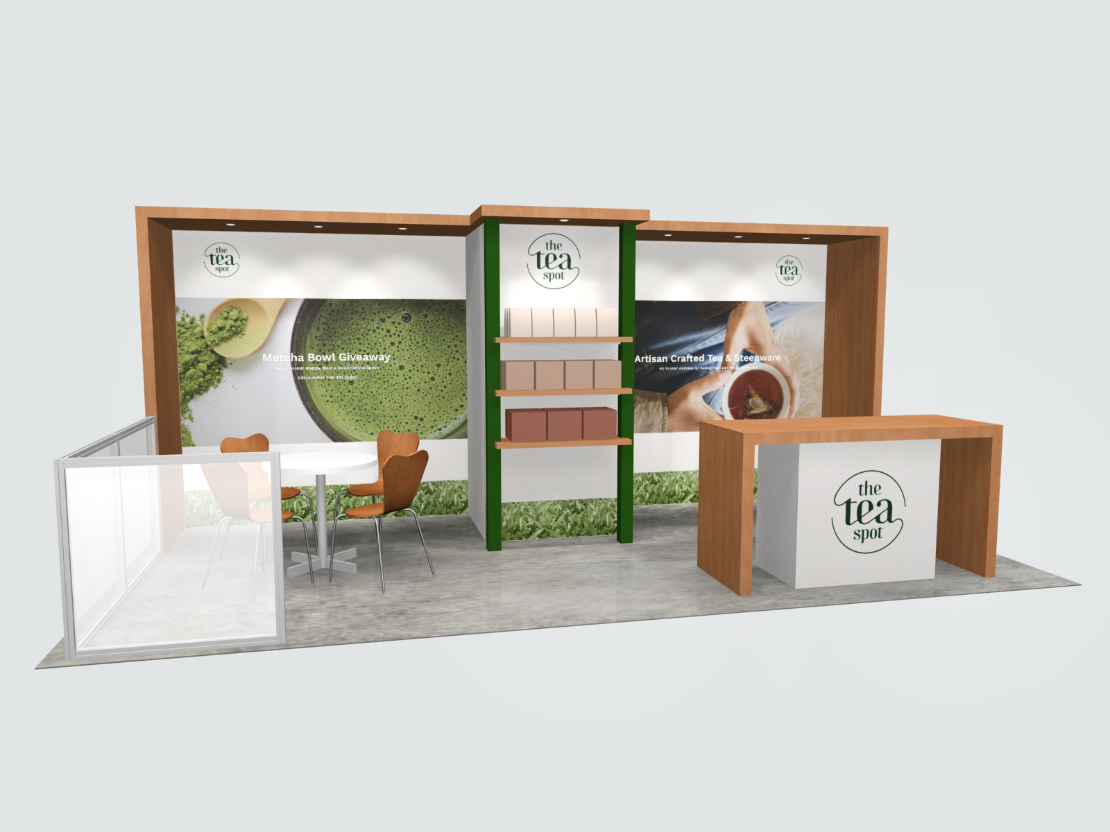 Engaging prospects at a trade show is important.. and you only have a limit time. The VK-4025 gives you all the tools to attract and engage attendees. Start with the large graphics on the backwall and along the aisle. There are three product shelves and a contemporary reception counter with locking storage. Need even more storage, the VK-4025 has a full-size closet for product samples or to store coats, laptops, and literature. The frosted plex corral wall creates a casual yet functional meeting area. Finally, the recessed soffit lighting gives the entire booth a professional and comfortable feeling.