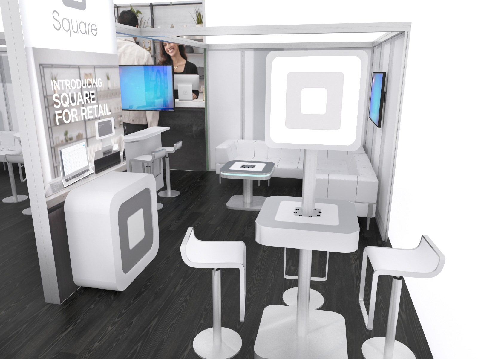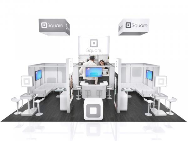 At every trade show, there's always one exhibit with an inviting vibe -- "Welcome. Relax. Spend some time away from all the chaos." The GK-5050 (RE-9130) is that booth. It blends large format backlit graphics and frosted acrylics into a casual space that includes multiple casual meeting areas. There are semi-private rooms with monitors and casual furniture, a large reception desk, and multiple charging stations to entice attendees. The overhead hanging signs make a statement in the exhibit hall, drawing attention and a crowd to the island exhibit. The GK-5050 is both a dramatic statement and a practical exhibit, perfect for any company that wants their trade show investment to create sales.