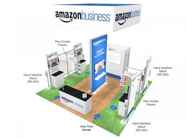 A well-designed rental island exhibit should be attractive, inviting, informative, and practical. The RE-9127 does all that... and more. It combines lightboxes and vibrant graphics with functional monitor kiosks in a booth design that welcomes business conversations and problem solving. There are multiple locking counters and a full-size closet for secure storage. The 12 ft. high central tower include meeting area. Finally a large square overhead hanging sign ensures visibility throughout the exhibit hall.