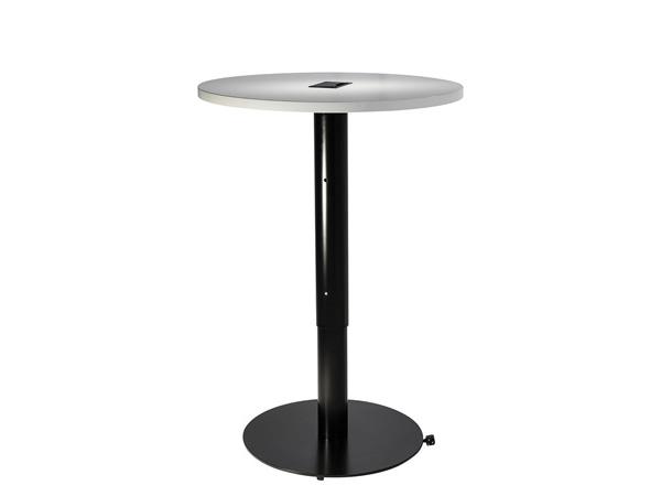 Modern 30" round bar table with black metal base features a power hub in the center with 1 AC and 2 USB ports, and wire management in the base. One 110V power source is required. Dims: 30" R, 42" H