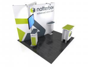 Most modern exhibitors have four basic requests: large graphics, interactive workspaces, modular assembly, and re-configurable designs. The GK-1011 series meets all those requirements. The Gravitee One-Step Modular Walls allow for seamless fabric or direct print graphics in a 10, 20 and 30 ft. inline space. The custom workstations are not only practical with a large monitor and locking storage, but also a stylish free-floating addition to the overall design. All three versions include the MOD-1158 reception counter with standoff graphics and locking storage. The backwall assembles quickly and the remaining components can be either fully assembled or partially assembled for modular packaging.