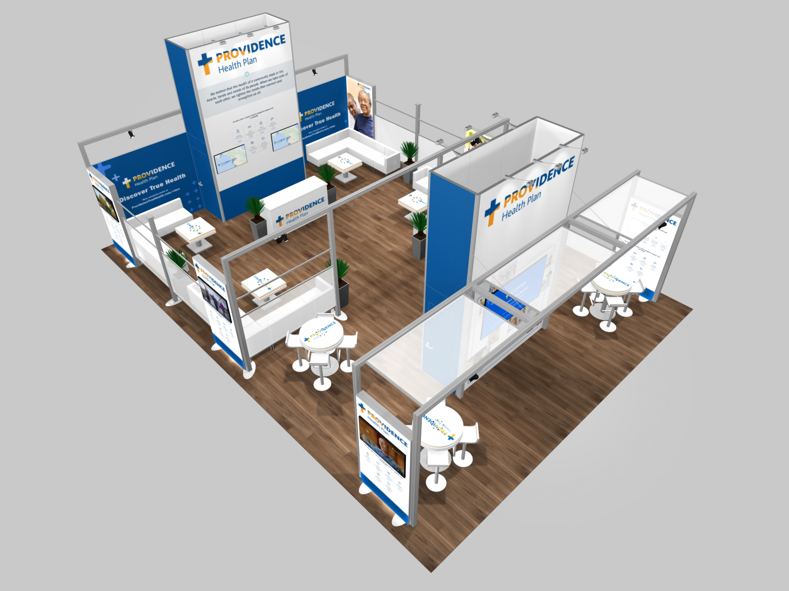 A well-designed rental island exhibit should be attractive, inviting, informative, and practical. The RE-9147 does all that... and more. It combines SuperNova lightboxes and vibrant graphics with upscale monitor kiosks in a booth design that welcomes business conversations and problem solving. There are multiple locking counters and a full-size closet for secure storage. The 12 ft. high central tower is perfect for storing product samples and equipment. Finally a large curved overhead hanging sign ensures visibility throughout the exhibit hall.