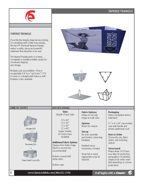 Trade shows and events are dominated by large hanging signs. Why? Because they attract attention. But great overhead hanging signs do more than just attract attention -- they draw enthusiastic crowds to your booth. Aero 3D and 2D Hanging Signs are designed to bring potential customers to your exhibit. Made with lightweight aluminum tubes and push-button connectors, Aero Hanging Signs complement the most imaginative trade show display.