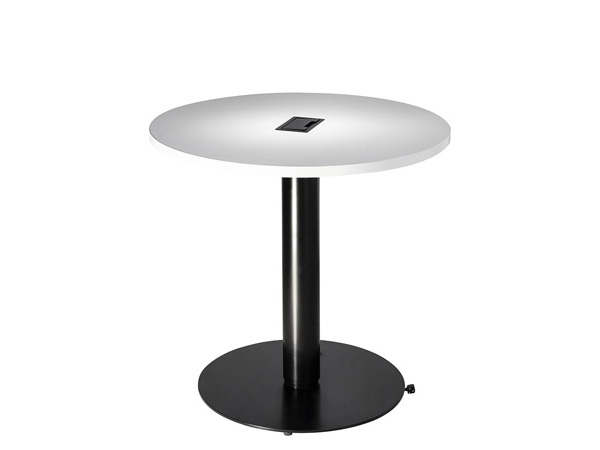 Modern 30" round cafe table with black metal base features a power hub in the center with 1 AC and 2 USB ports, and wire management in the base. One 110V power source is required. Dims: 30" R, 29" H