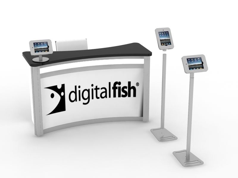The MOD-1370 has a split personality. It's a full feature, full-height iPad Kiosk which easily converts to a convenient iPad Counter Stand. It's constructed from lightweight durable engineered aluminum extrusion, built the withstand the years of trade show or retail abuse. The base rotates 360 degrees or can be locked to a fixed position. The rotating clamshell frame swivels between portrait and landscape, and has two anti-theft locks. There's even the option of graphics on the face plate or a rear halo to personize your iPad. The MOD-1370 is an affordable addition to any trade show backwall, counter, or workstation.