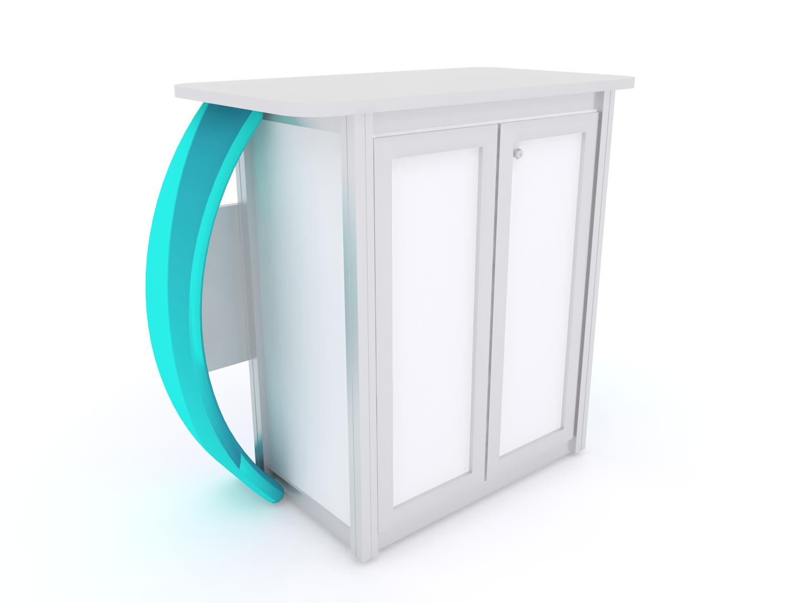 When choosing the right counter or pedestal for your display, consider how you will use it on the show floor. Do you need locking storage? Will the counter or pedestal hold a lead retrieval machine, laptop, or other electrical device? If so, you will need wire management. That may be as simple as ordering a grommet for the counter. If you are planning to use a tablet computer, consider the tablet insert option for the counter top. This option is practical, attractive, and secure for many tablets, such as an iPad.