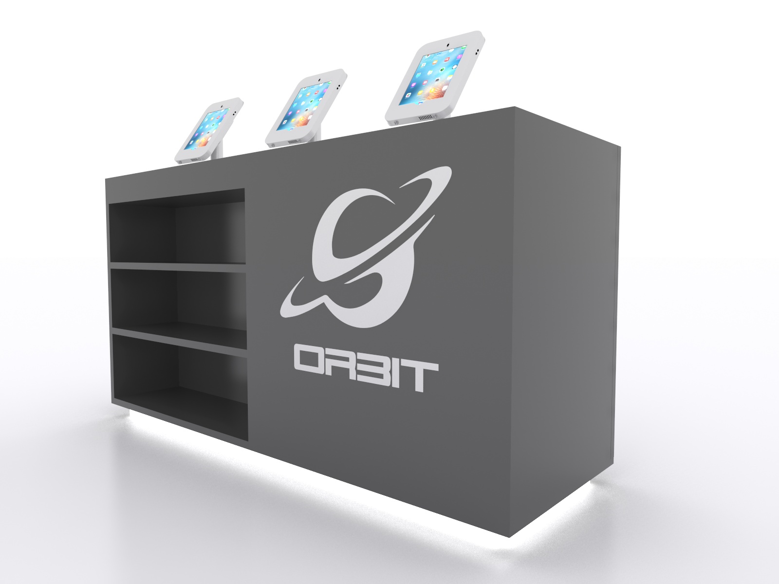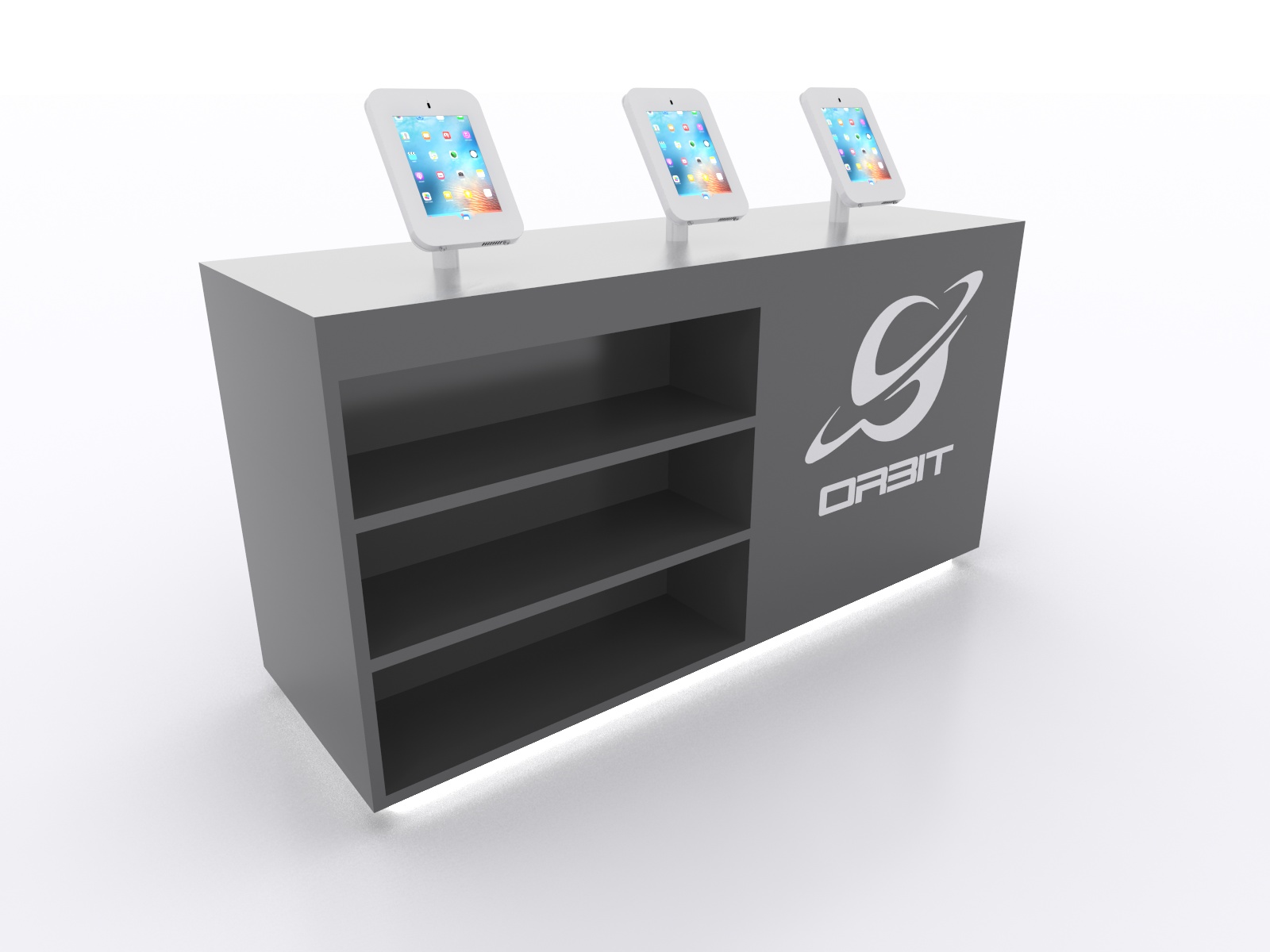 When choosing the right counter or pedestal for your display, consider how you will use it on the show floor. Do you need locking storage? Will the counter or pedestal hold a lead retrieval machine, laptop, or other electrical device? If so, you will need wire management. That may be as simple as ordering a grommet for the counter. If you are planning to use a tablet computer, consider the tablet insert option for the counter top. This option is practical, attractive, and secure for many tablets, such as an iPad.