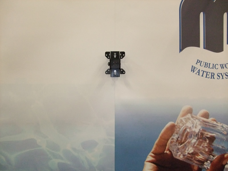 The fabric or graphic panels hang on pins that adhere to detachable steel channel bars with a magnet-to-metal connection. The panels are rollable to fit in the roto-molded case with wheels. The number of panels depends on the size of the frame.