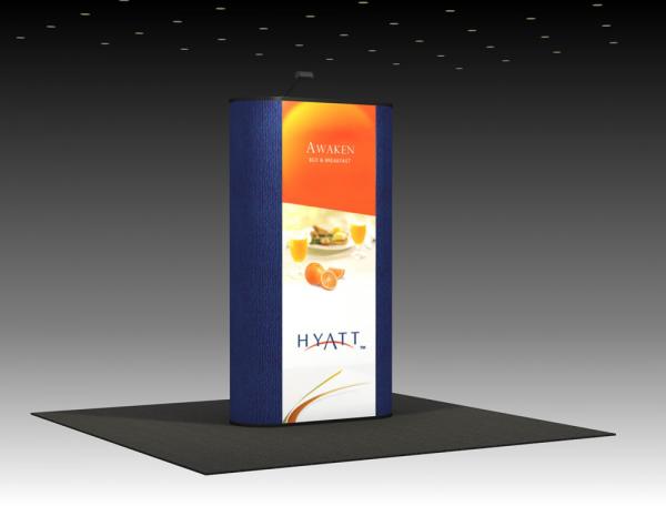The fabric or graphic panels hang on pins that adhere to detachable steel channel bars with a magnet-to-metal connection. The panels are rollable to fit in the roto-molded case with wheels. The number of panels depends on the size of the frame.