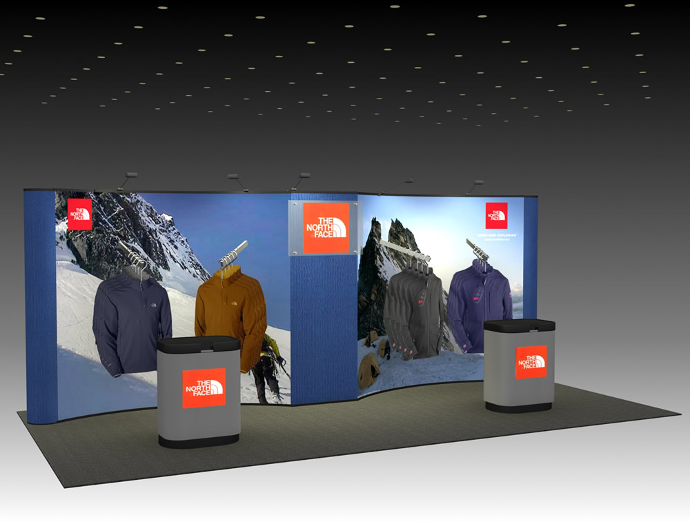 • 20 ft. Curved/Straight Pop Ups with (2) Fabric End Panels, (1) Fabric Connector Panel, and (6) Graphic Mural Front Panels