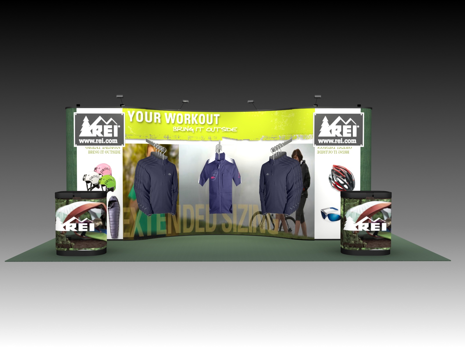 • 20 ft. Curved/Straight Pop Ups with (2) Fabric End Panels, (4) Graphic Mural Front Panels, (2) Graphic Mural Flat Panels, and (2) Graphic Mural Connector Panels