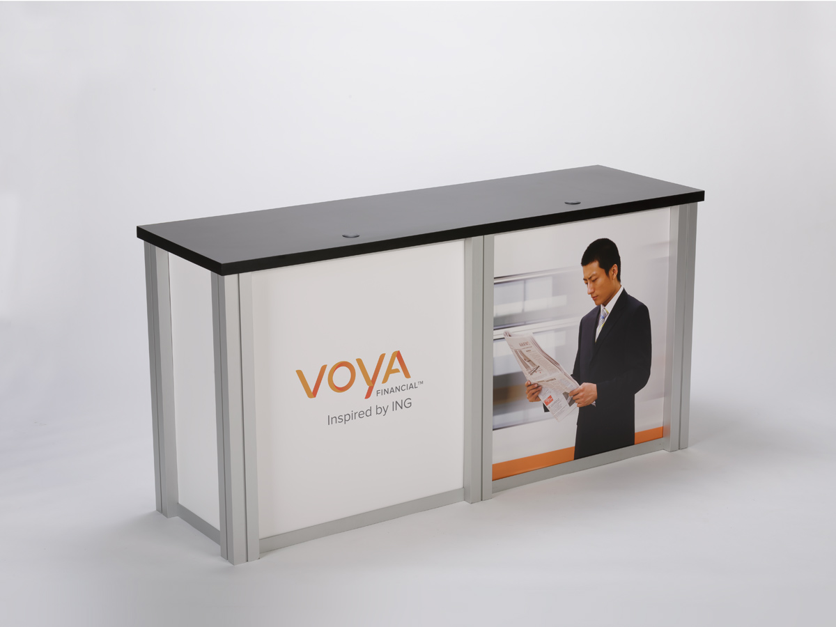 RE-1207 Rental Display / Large Counter / Workstation -- Image 1We offer a HUGE selection of contemporary rental accessories, including workstations, kiosks, conference tables, reception counters, display cases, cell phone charging stations, and iPad stands. Any of these components can be integrated into the inline or island designs, or rented as single units to add to your existing exhibit.