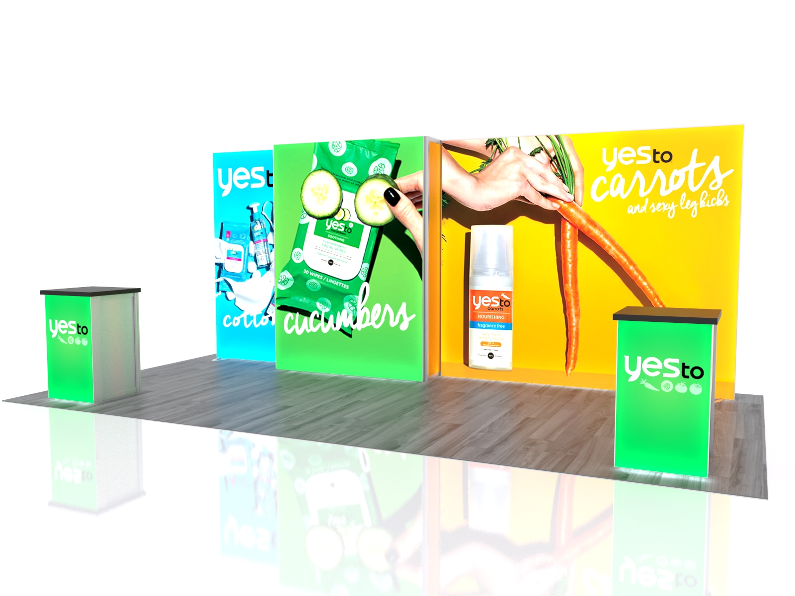 Quite often, a few custom elements added to the design can give the entire design a custom look even if it’s as simple as some colorful laminated workstations, shelves, or a reception counter. Custom laminated soffits and backlighting are also nice touches that are inexpensive and well worth the investment. As a bonus, if you re-rent the same exhibit, your second rental will most likely be less expensive, since your first rental covered the cost of those custom components.