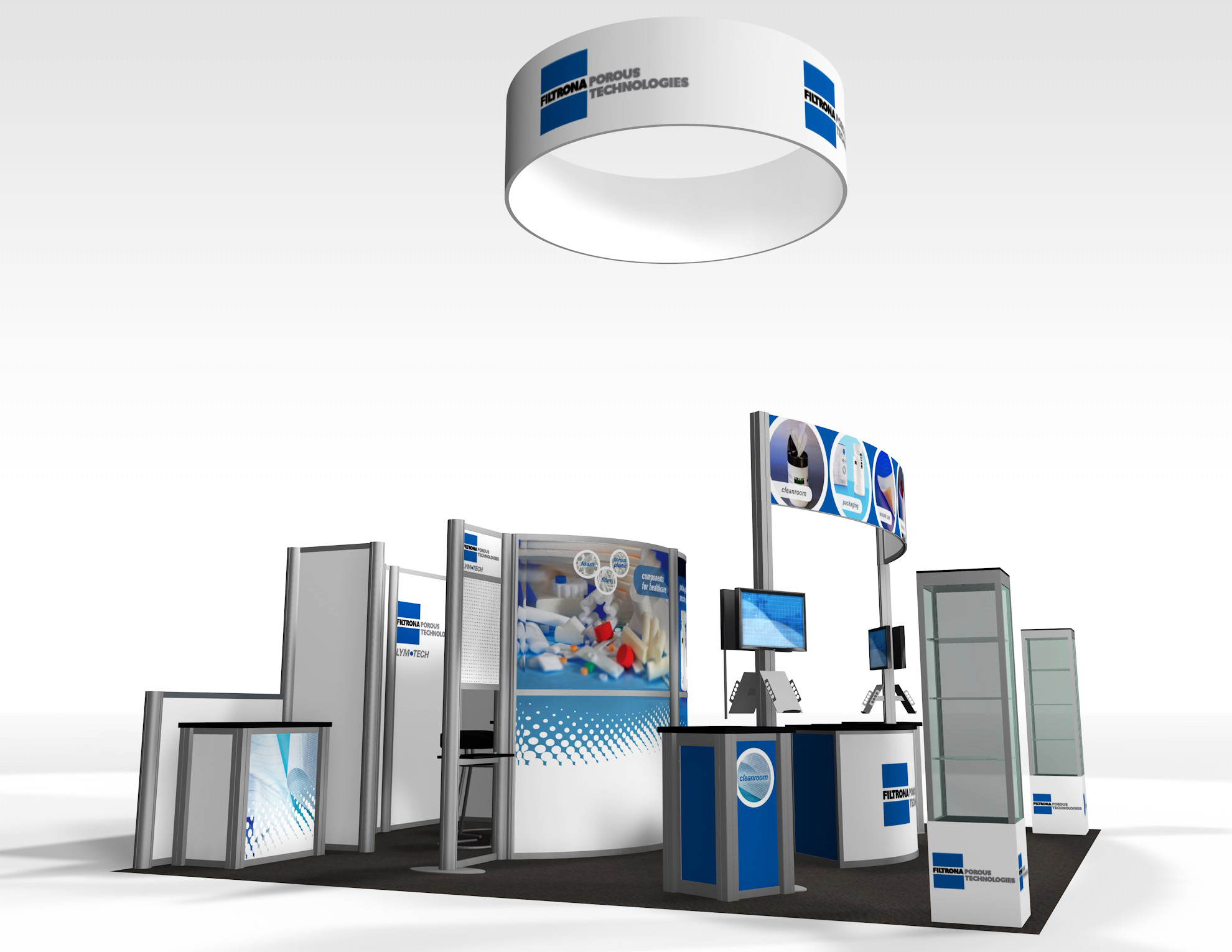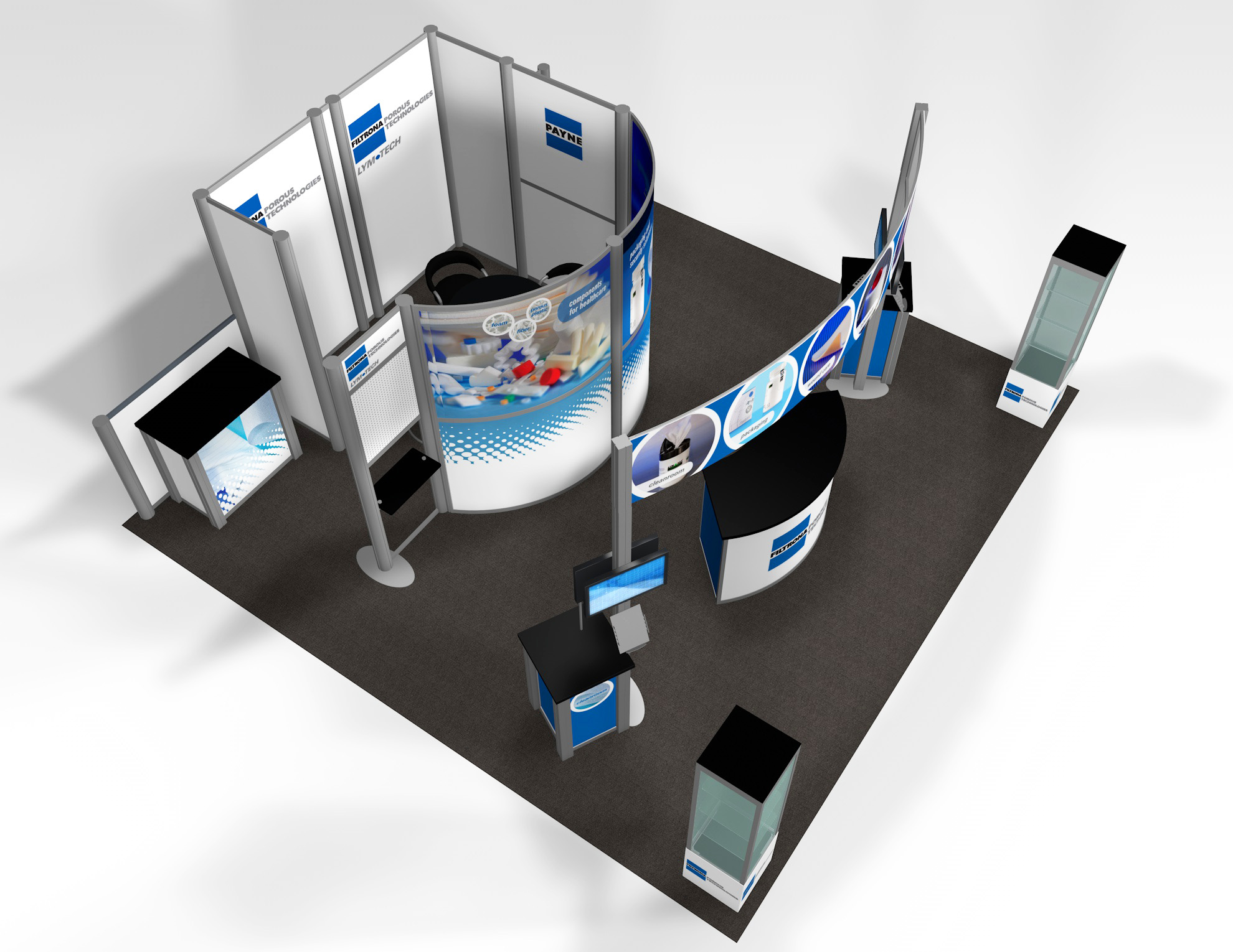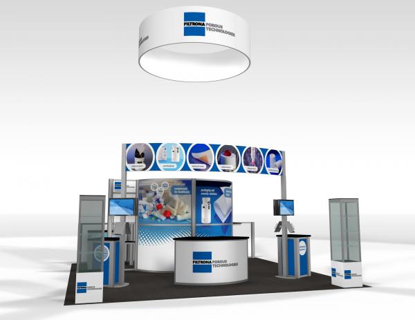 Quite often, a few custom elements added to the design can give the entire design a custom look even if it’s as simple as some colorful laminated workstations, shelves, or a reception counter. Custom laminated soffits and backlighting are also nice touches that are inexpensive and well worth the investment. As a bonus, if you re-rent the same exhibit, your second rental will most likely be less expensive, since your first rental covered the cost of those custom components.