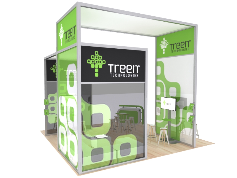 We often hear, "I'd like a comfortable booth space where customers can lounge and hear about our products and services." The VK-5096 does that ... and more! The large graphics and open construction invites attendees into your booth. Once there, they can sit at bar-height tables next to large monitors or relax in a semi-private lounge area. The layout makes it easy to engage your customers in face-to-face conversations or presentations. The island design includes an attractive reception counter with backlighting and storage. The large tension fabric graphics and engineered aluminum construction ensures a fast setup and years of use.