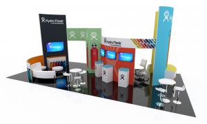 A well-designed, attractive, and practical island can be transformational for a company at a trade show. There's no better way to describe the re-configurable GK-5149, GK-5150, and GK-5051. The GK-5149 and GK-5150 20 x 20 islands maximize the available space with double-sided curved panels. The design includes monitors, meeting areas, optional pedestals, and large tension fabric graphics. In addition, the islands have multiple seating areas shown with rental furniture. All the curved panels are from the patented Gravitee System, so individual panels connect without tools and there are no loose parts or pieces. The (2) 20 x 20 islands connect seamlessly to create the larger 20 x 40 version.