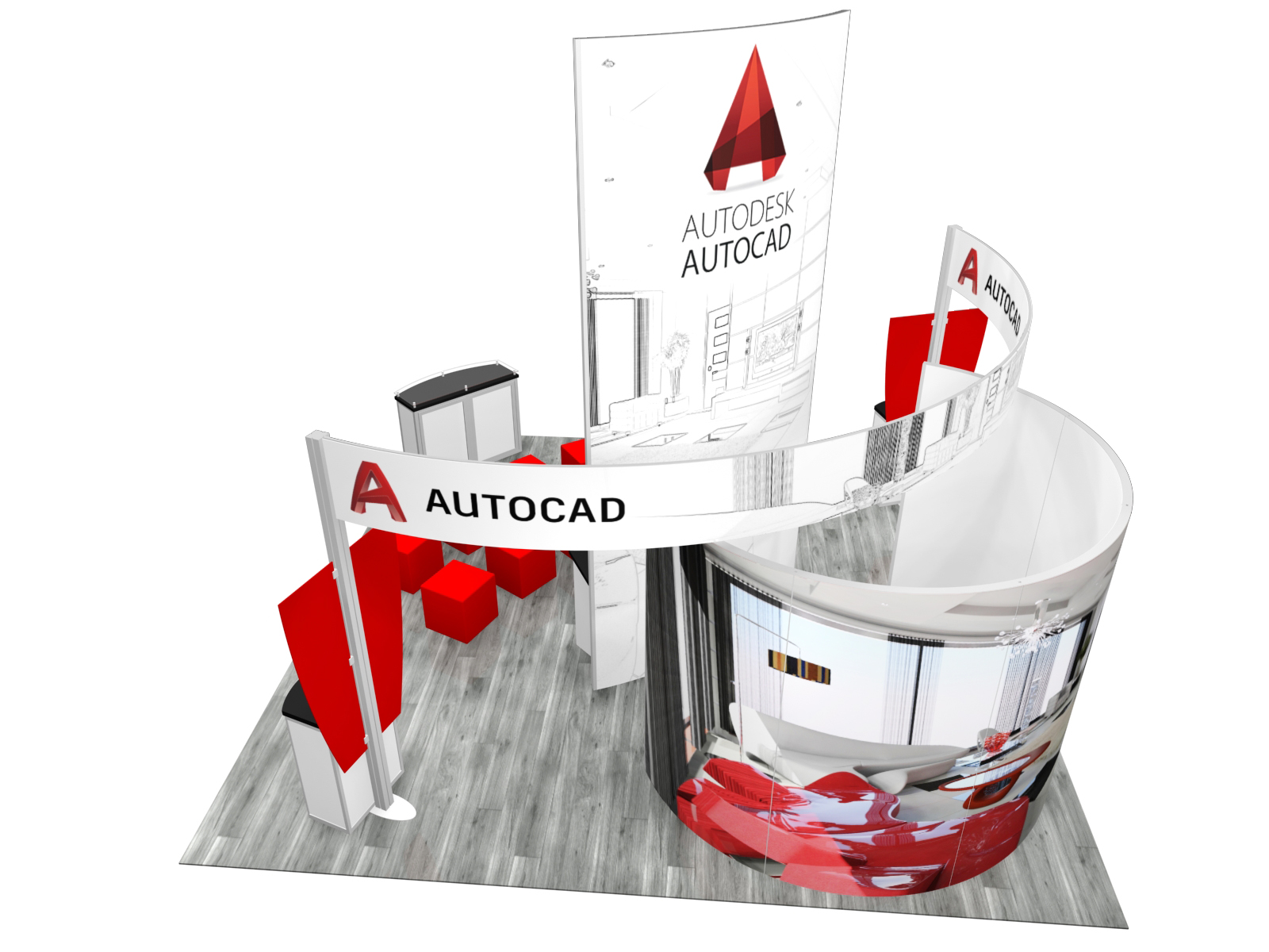 There are rental islands. Then there are Gravitee One-Step Island Exhibits. When you choose a RE-9120 Gravitee Island, you get a contemporary display with large graphics, practical accessories, a mostly tool-less assembly. The full-size panels slide together with attached connectors, whether flat or curved. Most islands pack in one or two crates, saving you on freight and drayage (material handling). And assembly takes about half the time of a traditional custom exhibit. The RE-9120 includes an attractive curved reception counter (RE-1207) with storage, a casual presentation area, and convenient workstations with monitor options. Plus, the RE-0120 comes with a semi-private meeting room and locking storage in all the counters.