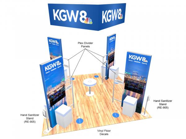 A large trade show exhibit should be inviting, practical, and (when done well) seductive. The RE-9129 rental island has all that and more. The 10 ft. square hanging sign announces your presence throughout the show hall, encouraging attendees to visit your booth. The (4) vibrant backlit LED lightboxes with tension fabric graphics are effective branding towers as well as demonstrations stations with (8) monitor stands. The RE-1575 custom square pedestals with LED accent lights compliment the overall theme, and the colors can be adjusted to match the graphics.
