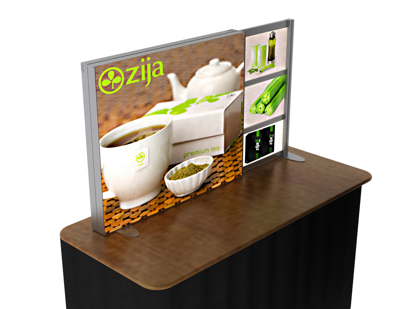 • Sacagawea: Aluminum extrusion and tension fabric table tops with accessories such as standoff graphics, headers, and shelves. Perfect for just about any situation.