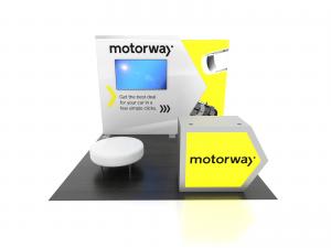 These distinctive Inline lightbox designs blend exceptionally bright LED lights, an aluminum SEG frame, and vibrant fabric graphics into a brilliant eye-catching display. The large LED lightbox spans the display and is framed with angular SEG frames. The left section supports a large monitor. Upfront there's a modified MOD-1589 backlit reception counter with wireless and USB charging ports. The design includes integrated cord management. You won't believe your eyes the first time you flip the switch and see how stunning your backlit graphic can be.