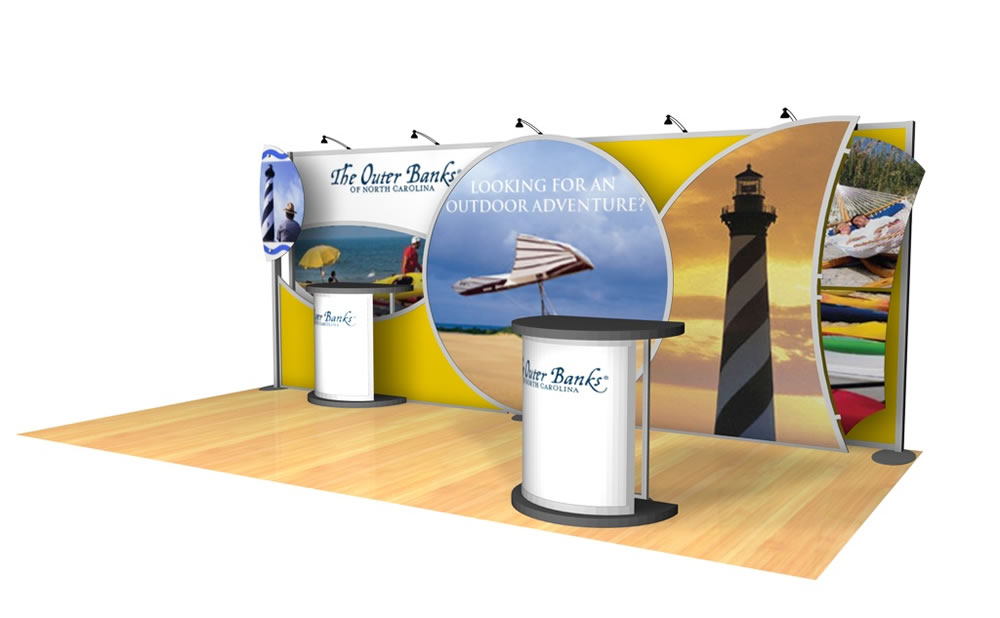 Hybrid is a relatively new category of trade show displays. Generally, hybrid displays incorporate aluminum extrusion, tension fabric, and other display components such as laminates, wood, Sintra, and other materials to create a tabletop, inline, or island exhibit.