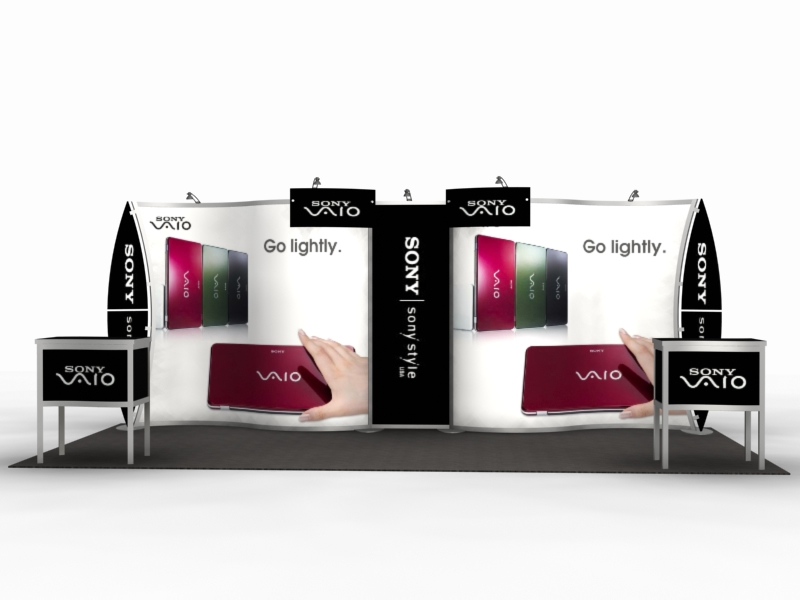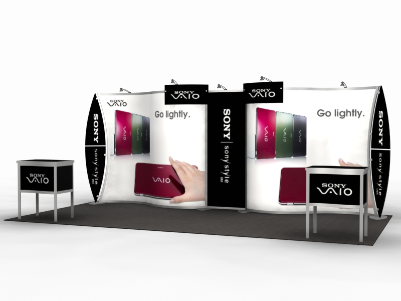 If you like curves, and who doesn’t like curves, then you’ll love the Magellan MOR. The Magellan MOR makes a bold statement at any trade show with its flowing lines and large format tension fabric graphic(s). Simply assemble the lightweight engineered aluminum frame with the quick assist knobs, unfold the fabric graphics, and attach them to the Velcro already on the frame. Options include workstations, headers, 9 wing colors, and monitor mounts. Choose from (6) 10 ft and 20 ft. kits.