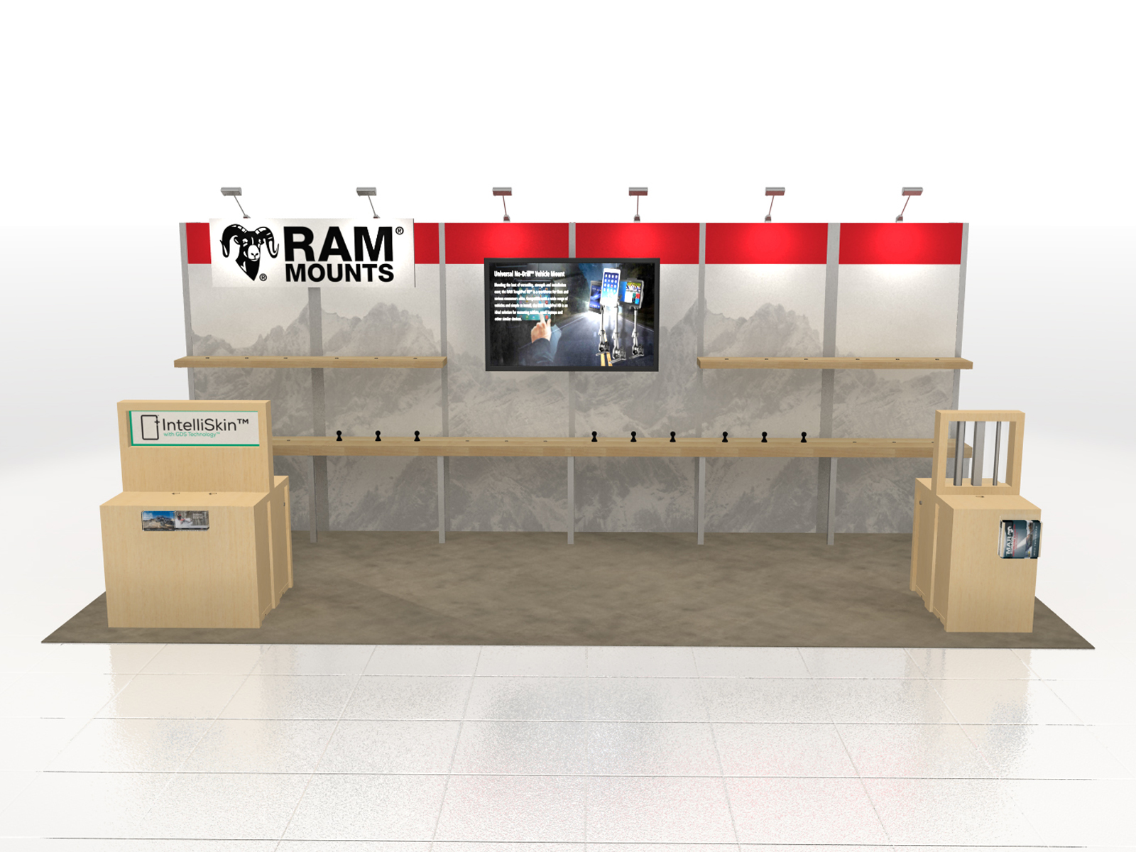 The VK-2980 is all about your products. It includes 30 ft. of shelves along the backwall, easily customizable to showcase your products. There are two demo stations each with locking storage. The backwall graphics can be direct prints or fabric, depending on your preference. And when a hands-on demo isn't enough, the exhibit has a monitor mount option for showing videos or browsing your website. The modular hybrid construction means the backwall will assemble quickly and the custom demo stations slide out of the case ready to go.